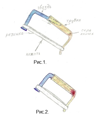 Для его изготовления бралась трубочка, если не ошибаюсь, латунная, длиной сантиметров 15 и диаметром миллиметров 6-8 (оцениваю на глаз, по памяти). Трубка сгибалась примерно посередине или чуть меньше и один конец сплющивался и сгибался. Далее, брался гвоздь диаметром меньшим чем трубка и сгибался пополам. Еще была нужна резинка. В трубку счищали головки спичек и утрамбовывали этим гвоздем. После чего гвоздь вставляли в трубку чуть-чуть под углом и за ушко гвоздя и сплющенную часть трубки натягивалась резинка. Таким образом гвоздь оставался в неустойчивом положение. (Рис.1) Теперь, если нажать на резинку, как показано на рисунке, то гвоздь соскальзывал внутрь трубки, ударялся острием в серу спичек и происходил хлопок-взрыв. (Рис.2) Считалось, что две головки спичек - это слабенький и безопасный заряд. В этом случае спичечник держали в руках, нажимая пальцами на резинку. Четыре спички - это уже серьезнее. И тогда зарядив пугач таким образом, его бросали так, чтоб резинка ударялась о что-нибудь, чтоб гвоздь соскочил в трубку. Иногда гвоздь от взрыва серы выскакивал из трубки. В общем забава была не вполне безопасной.